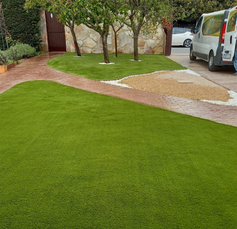 Cada vez más utilizado por ayuntamientos para vestir con rollos de césped artificial (usado en campo futbol y por tanto de segunda mano) calles, glorietas, rotondas y parques púbicos.