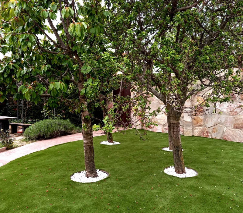 Cambiar la superficie de tierra o césped natural del jardín de casa por hierba artificial reutilizada. Un toque bonito, más sencillo y económico.